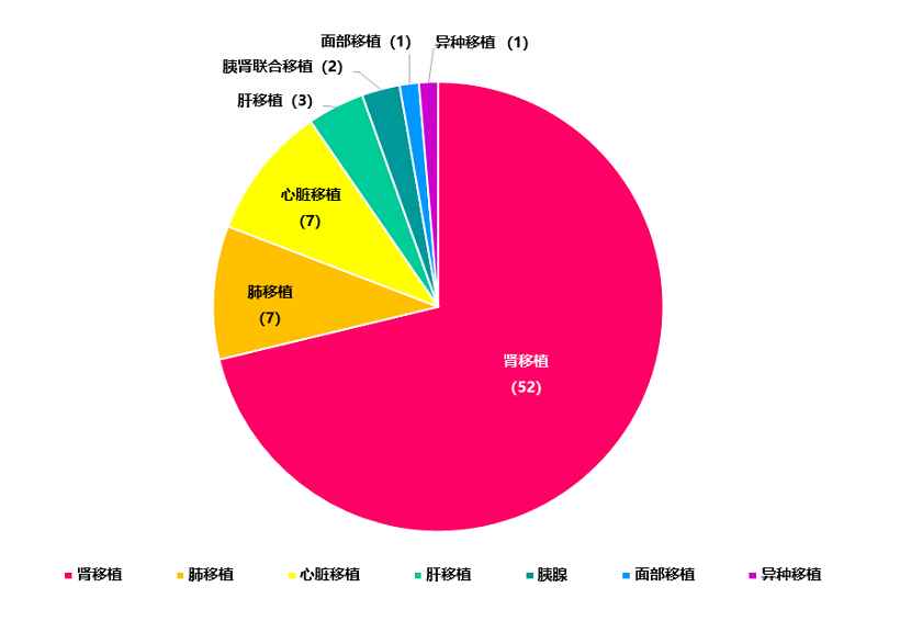 作为器官移植领域的新兴生物标志物,供体来源cfDNA(ddcfDNA)在本届大会研究收录中继续大放异彩:从研究成果数量看,今年共涌现了来自美国、加拿大、德国、巴西等国的共76篇相关研究报道,相比去年多了27篇(图1);从研究方向看,随着ddcfDNA从理论走向临床,研究进一步深入到“ddcfDNA检测值的影响因素”、“与穿刺病理Banff指标的进一步关联分析”及“临床实际使用经验总结”等更加细分的领域(图2);从入组患者数量看,今年入组患者共有46,968例,约为去年的五倍(图1),更大规模的入组样本研究为临床使用提供了更多参考价值;从移植器官类型看,肾移植依然是研究文献最多的(52篇),其次是心脏移植(7篇)和肺脏移植(7篇),异种移植在ddcfDNA方面的研究也开始报道(图3)。